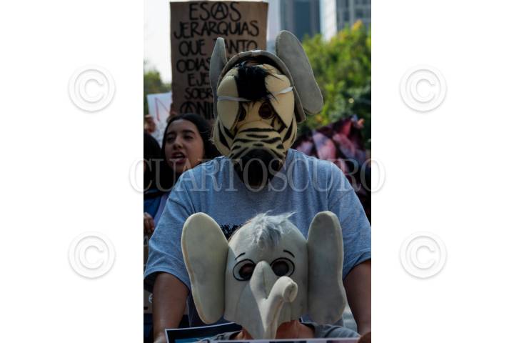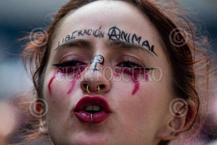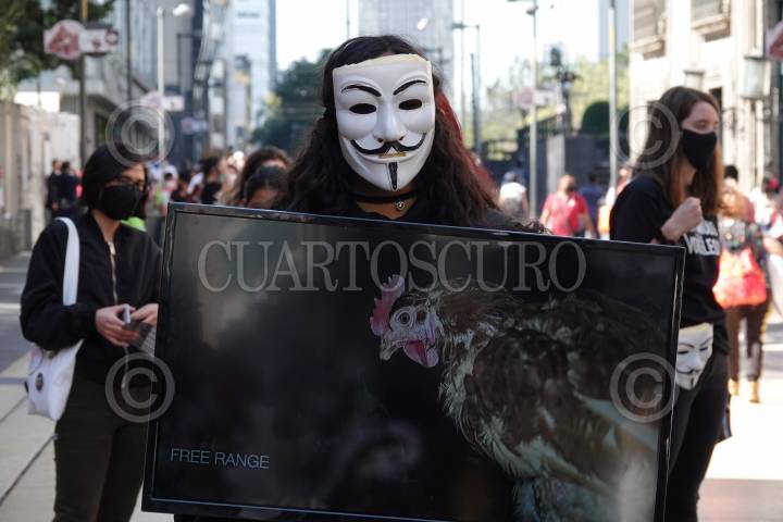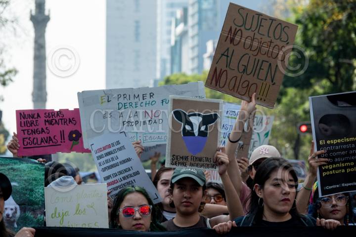 CIUDAD DE MÉXICO, 11NOVIEMBRE2023.- Organizaciones sociales en defensa de los derechos animales y contra el especismo se manifestaron del Ángel de la Independencia al Zócalo capitalino. Con pancartas, personificados como animales y una batucada las y los asistentes expresaron que la solución es el veganismo y que la empatía abarque a todas las especies animales y no sólo a los que son domésticos. FOTO: GALO CAÑAS/CUARTOSCURO.COM