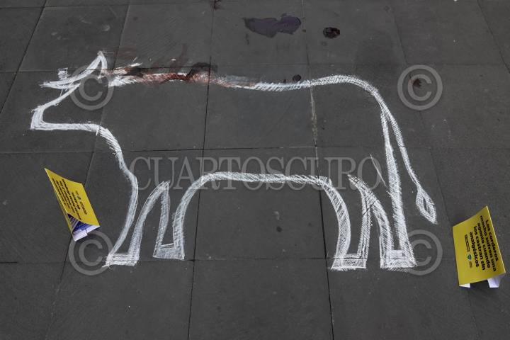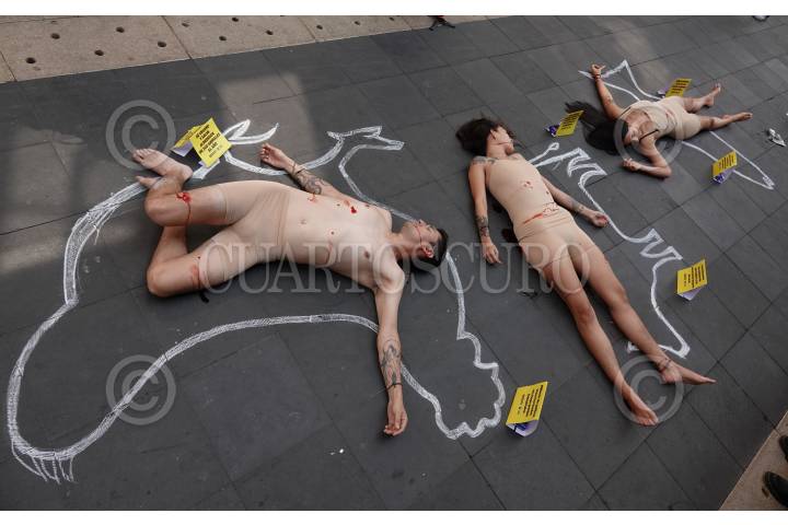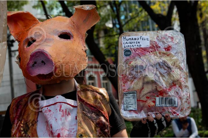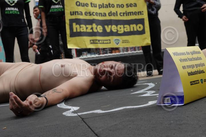 Activistas realizaron el performance “Que tu plato no sea una escena del crimen”, para sensibilizar a los transeúntes sobre la crueldad con la que son sometidos los animales