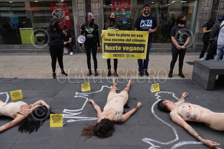 Mujeres protestaron contra el consumo de carne sobre la calle de Madero, en el Centro Histórico.