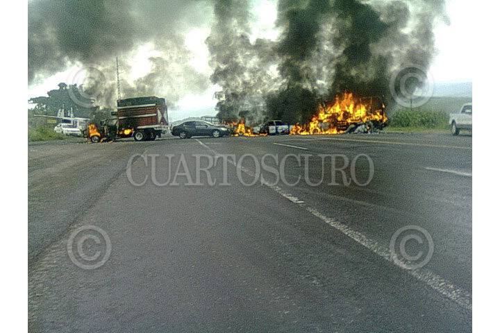 APATZINGAN, MICHOACÁN, 10AGOSTO2012.- Balaceras y bloqueos se han presentado en el municipio, derivado de enfrentamientos entre Policías Federales y presuntos miembros del crimen organizado. Según la información local, alrededor de diez vehículos han sido incendiados, mientras que se habla de un saldo preliminar de siete policías federales heridos. FOTO: TOMADA DE INTERNET /CUARTOSCURO.COM