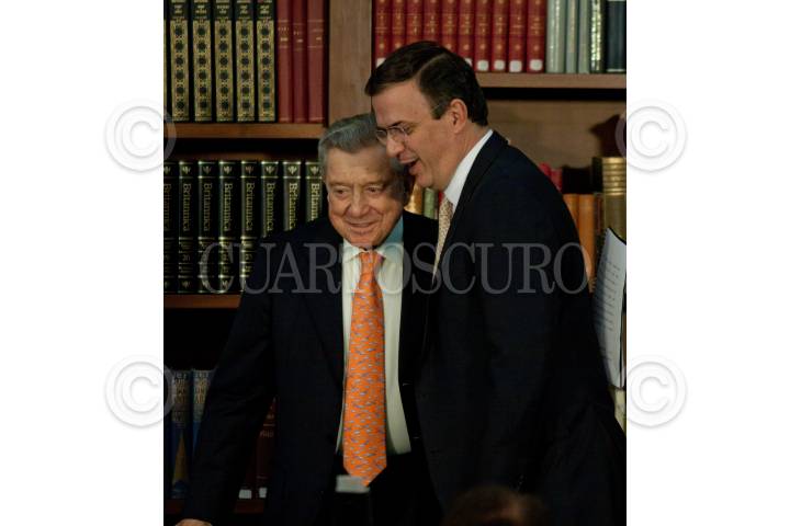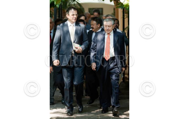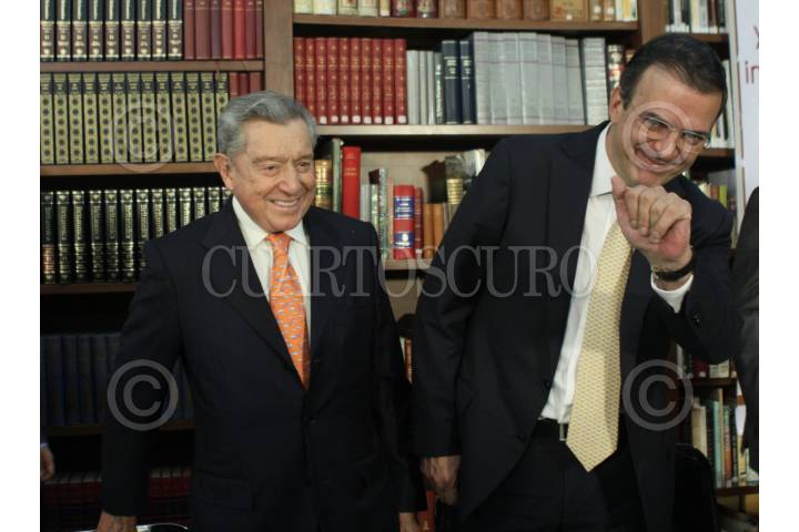 MÉXICO, D.F., 20MAYO2011.- Miguel Alemán Velasco, presidente de la fundación Miguel Alemán y Marcelo Ebrard Casaubón, Jefe de Gobierno, durante firma del convenio de colaboración con la Fundación Miguel Alemán y la Secretaría de Salud del Distrito Federal que tiene como objeto la colaboración para apoyar el desarrollo de proyectos de investigación en el campo de la salud y la premiación de los más destacados investigadores en esa área. FOTO: MOISÉS PABLO/CUARTOSCURO.COM