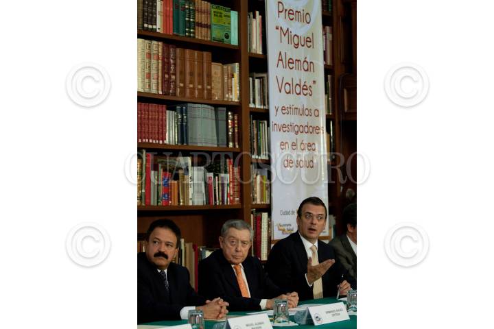MÉXICO, D.F., 20MAYO2011.- Armando Ahued, secretario de Salud local, Miguel Alemán Velasco, presidente de la fundación Miguel Alemán, y Marcelo Ebrard Casaubón, Jefe de Gobierno, durante firma del convenio de colaboración con la Fundación Miguel Alemán y la Secretaría de Salud del Distrito Federal que tiene como objeto la colaboración para apoyar el desarrollo de proyectos de investigación en el campo de la salud y la premiación de los más destacados investigadores en esa área. FOTO: MOISÉS PABLO/CUARTOSCURO.COM