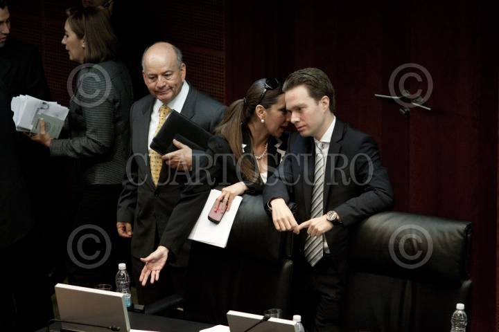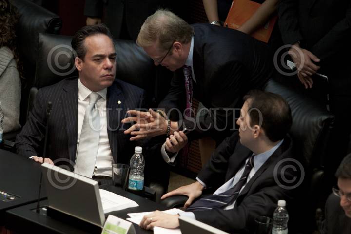 MÉXICO, D.F., 20OCTUBRE2011.- Los senadores Sergio Garibay, PRD, María Elena Orantes, PRI, y Manuel Velasco, PVEM, durante la sesión en la que se ratificó la medalla Belisario Domínguez a el Ingeniero Cuauhtémoc Cárdenas. FOTO: MOISÉS PABLO/CUARTOSCURO.COM