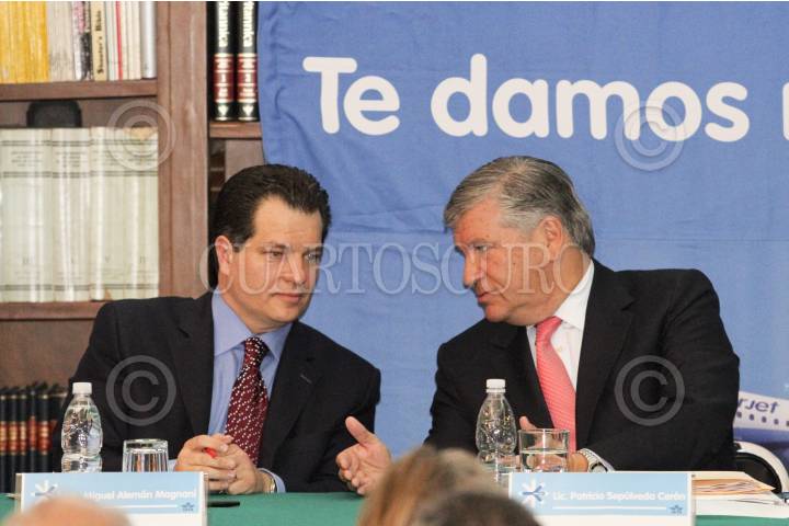 MÉXICO, D.F., 22MAYO2012.- Miguel Alemán Magnani, presidente Ejecutivo de Interjet y Miguel Alemán Velasco, presidente del Consejo de Interjet, durante la entrega del galardón IATA a la firma aérea. FOTO: SAÚL LÓPEZ /CUARTOSCURO.COM