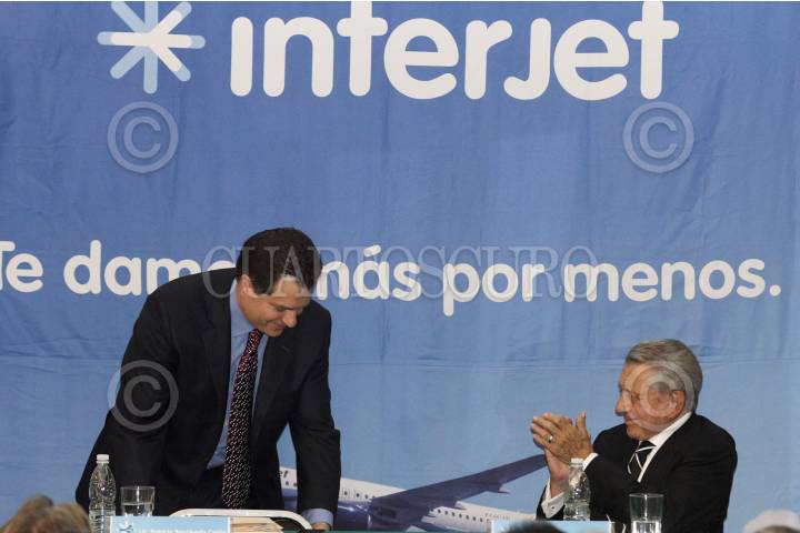 MÉXICO, D.F., 22MAYO2012.- Miguel Alemán Magnani, presidente Ejecutivo de Interjet, platica con Patricio Sepúlveda Cerón, representante de la Asociación de Transporte Aéreo Internacional durante la entrega del galardón IATA a la firma aérea Interjet. FOTO: SAÚL LÓPEZ /CUARTOSCURO.COM