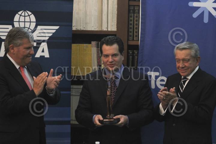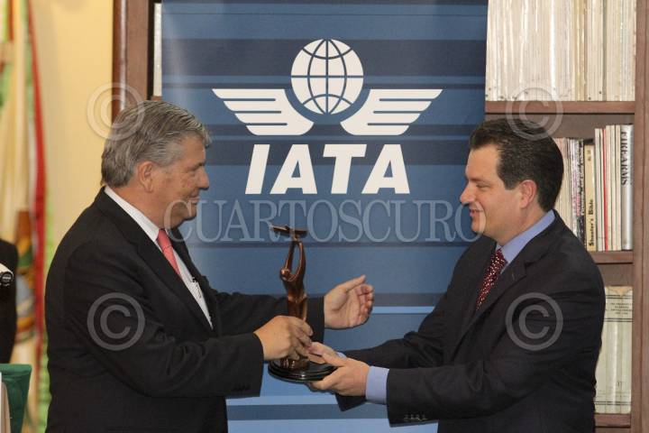MÉXICO, D.F., 22MAYO2012.- Miguel Alemán Magnani, presidente Ejecutivo de Interjet, junto con Patricio Sepúlveda Cerón, representante de la Asociación de Transporte Aéreo Internacional durante la entrega del galardón IATA a la firma aérea Interjet. FOTO: SAÚL LÓPEZ /CUARTOSCURO.COM