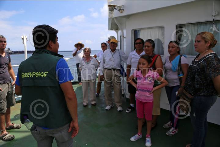 VERACRUZ, VERACRUZ, 10OCTUBRE2015.- El velero Esperanza de la ONG Greenpeace llegó esta mañana al muelle de la T, donde estará hasta el martes cuando zarpará a Progreso donde continuarán con las actividades de información y difusión. Ofrecieron una conferencia con 3 especialistas de la temática del agua y los daños del fracking FOTO: ILSE HUESCA /CUARTOSCURO.COM