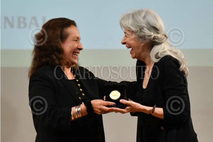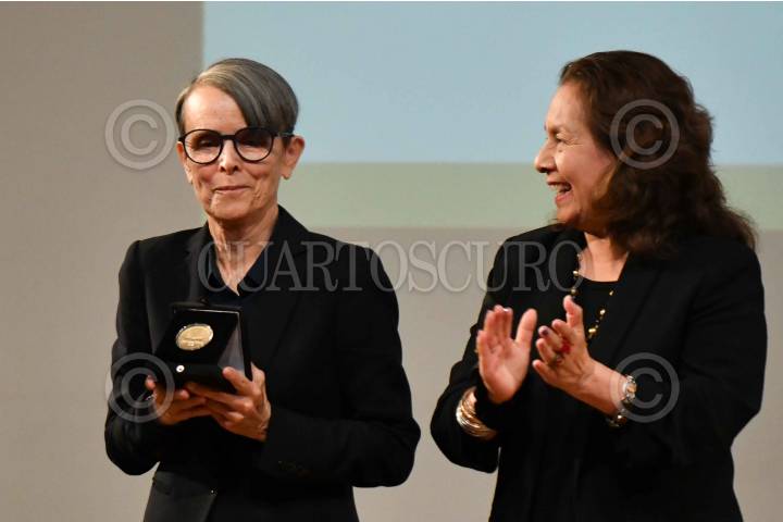 CIUDAD DE MÉXICO, 11SEPTIEMBRE2024.- Pura López Colomé, poeta y escritora, recibió la "Medalla Bellas Artes" en la rama de literatura de manos de Lucina Jiménez, directora general del INBAL. El evento fue realizado en la sala Manuel M. Ponce del Palacio de Bellas Artes. FOTO: MARIO JASSO/CUARTOSCURO.COM