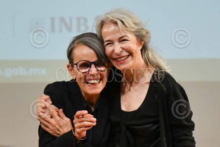 CIUDAD DE MÉXICO, 11SEPTIEMBRE2024.-Pura López Colomé, poeta y escritora, y Verónica Murguía, escritora, se abrazan luego de recibir la "Medalla Bellas Artes" en la rama de literatura. El evento fue realizado en la sala Manuel M. Ponce del Palacio de Bellas Artes. FOTO: MARIO JASSO/CUARTOSCURO.COM