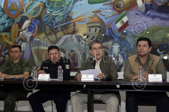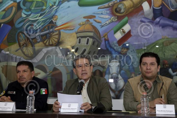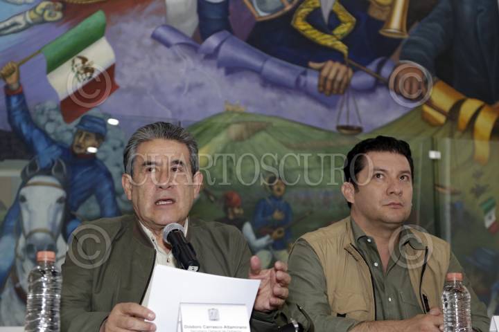 PUEBLA, PUEBLA, 02JUNIO2018.- Diódoro Carrasco, secretario general de gobierno del estado acompañado por el secretario de seguridad Jesús Morales e integrantes del gabinete de seguridad, dieron a conocer los detalles del homicidio de Juana Irais Maldonado, candidata a diputada local y Erika Cázares, regidora, ambas del Partido Verde Ecologista, registrado en la localidad de Cacahuatlán en Zihuateutla. Dieron a conocer que hay cinco personas detenidas que serán investigadas para descartar o fincar responsabilidades. FOTO: HILDA RIOS /CUARTOSCURO.COM