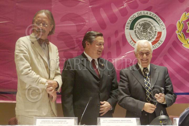 MÉXICO, D.F. 16ABRIL2004.- Comenzaron los trabajos de la 110 Asamblea de la Unión Interparlamentaria. En la gráfica Anders B. Johnsson (Secretario General de la UIP), Fernando Margáin (Senador mexicano presidente de la comisión de relaciones exteriores) y Sergio Páez Verdugo ( Presidente de la Unión Interparlamentaria). FOTO: Iván Stephens/CUARTOSCURO.COM