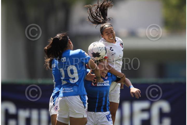 Nancy Zaragoza de Cruz Azul y Verónica Pérez Atlas durante el partido de fútbol correspondiente a la jornada 13 del torneo Clausura 2022 “Grita por la paz” de la Liga MX Femenil entre Cruz Azul vs Atlas en el Centro de Alto Rendimiento La Noria.
