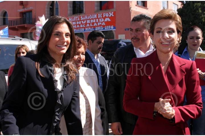 TEMASCALAPA, ESTADO DE MEXICO, 26ENERO2005.- Maude Versini, esposa del gobernador de Arturo Montiel y Marta Sahagún, primera dama realizaron una gira en el marco de su compromiso con la educación, el combate y prevención a las adicciones y la lucha hacia el maltrato de las mujeres y menores, en la explanada principal del municipio mexiquense. FOTO: Moisés Pablo/CUARTOSCURO.COM