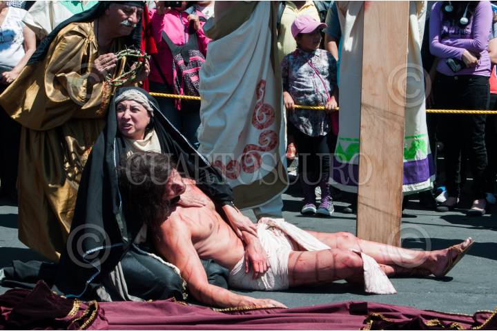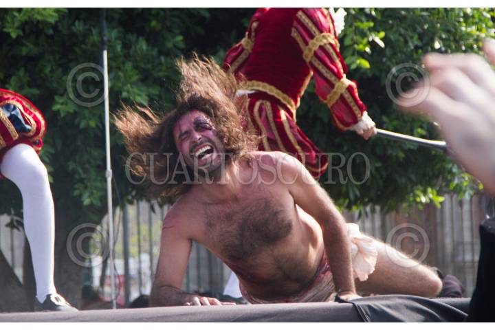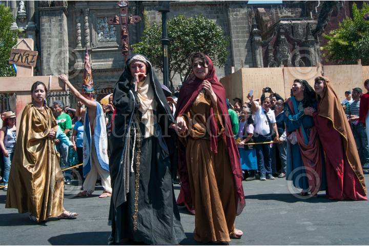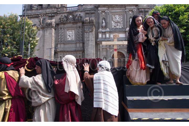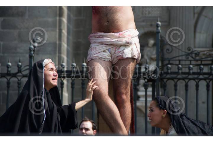 CIUDAD DE MÉXICO, 25MARZO2016.- Un grupo de actores, pertenecientes a la Compañía Nacional de Teatro Clásico “Fénix Novohispano”, realizaron la representación de la Pasión de Cristo en el primer cuadro del Centro Histórico de la Ciudad de México, la característica principal de la puesta en escena fue el vestuario y los accesorios, que evocaron el vía crucis que se realizaba en el siglo XVI afuera de la catedral metropolitana. FOTO: DIEGO SIMÓN SÁNCHEZ /CUARTOSCURO.COM