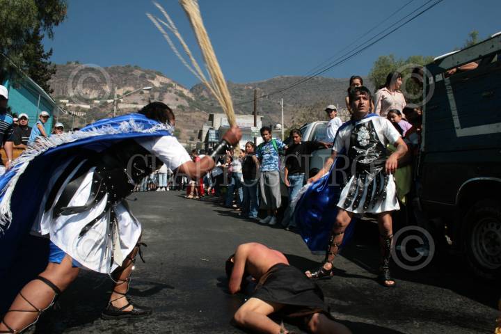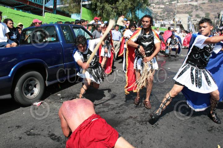 MEXICO, D.F.06ABRIL2007.-En la colonia Chalma de Guadalupe, en la delegación Gustavo A. Madero, tambien se hace la representación del Viacruces; comenzando con el azote a los ladrones por parte de los soldados romanos. FOTO JEFTÉ ARGUELLO/CUARTOSCURO.COM