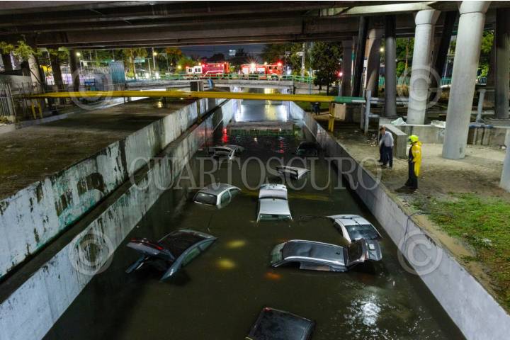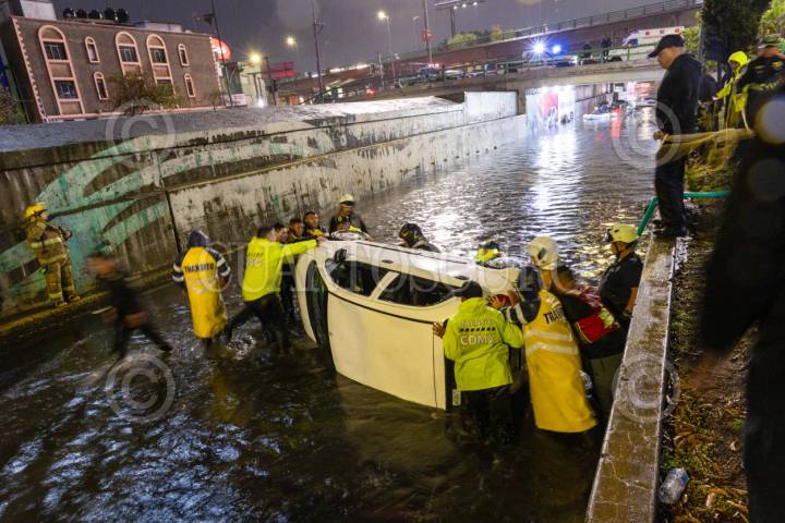CIUDAD DE MÉXICO, 03JUNIO2025.- Tras las intensas lluvias de anoche el Viaducto Río de la Piedad, a la altura de Troncoso, se inundó quedando atrapados varios coches, sus conductores auxilios por personal de la Secretaría de Seguridad Pública para desalojar sus unidades. Se pronostica que hoy continuarán las precipitaciones pluviales. FOTO: CUARTOSCURO.COM