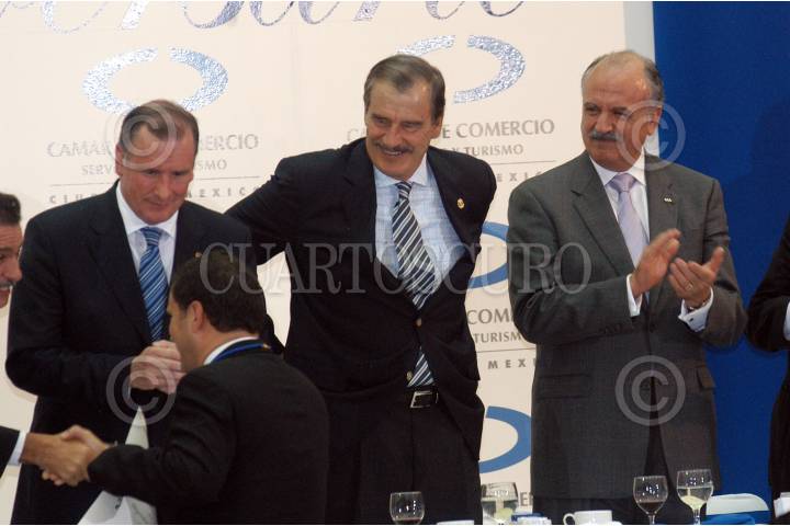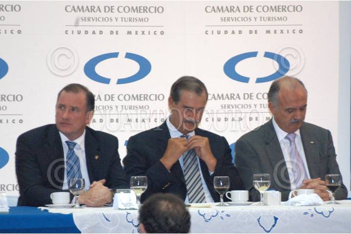 MÉXICO D.F. 24AGOSTO2006.- Lorenzo Yasasi Martínez, presidente del consejo de la Camara Nacional de Comercio y Servicios Turisticos el presidente Vicenta Fox y José Luis Barraza, del Consejo cordinador empresarial, durante la reunión por el 132 aniversario de la camara en el campo Marte. FOTO: Guillermo Perea/CUARTOSCURO.COM