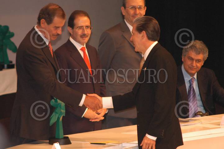 MÉXICO, D.F 09NOVIEMBRE2005.- El Presidente, Vicente Fox; Eduardo Romero Ramos, Secretario de la Función Pública y Julio Frenk, Secretario de Salud, durante la entrega de Premios y Reconocimientos a la innovación y a la calidad en la administaración Pública . FOTO: Miriam Sánchez/CUARTOSCURO.COM