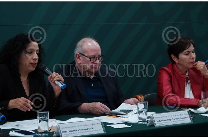 CIUDAD DE MÉXICO, 09FEBRERO2024.- Alejandra Méndez Girón, coordinadora General del Servicio Meteorológico Nacional, Víctor Hugo Páramo, coordinar ejecutivo de la Comisión Ambiental de la Megalópolis, y Marina Robles, secretaria de Medio Ambiente capitalina, durante la conferencia "Acciones para la temporada de ozono 2024 en la Zona Metropolitana del Valle de México" en la sede de la Secretaria de Medio Ambiente y Recursos Naturales (Semarnat). FOTO: GALO CAÑAS/CUARTOSCURO.COM
