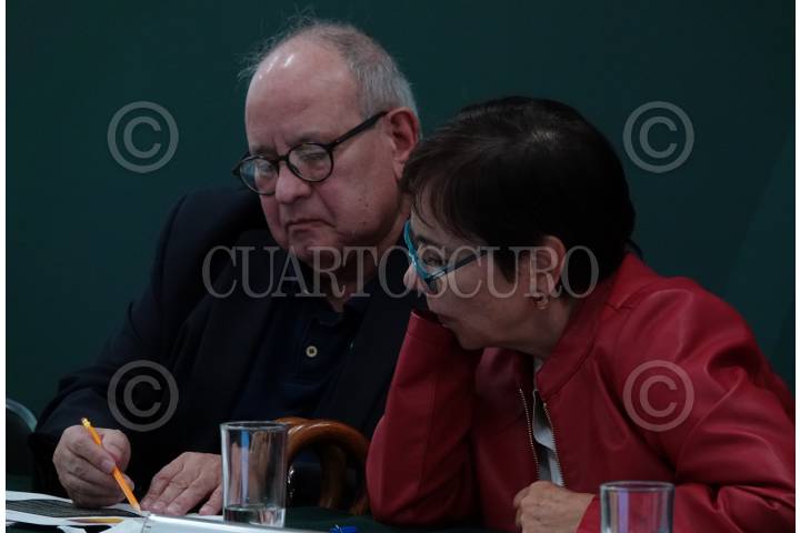 CIUDAD DE MÉXICO, 09FEBRERO2024.- Víctor Hugo Páramo, coordinar ejecutivo de la Comisión Ambiental de la Megalópolis, y Marina Robles, secretaria de Medio Ambiente capitalina, durante la conferencia "Acciones para la temporada de ozono 2024 en la Zona Metropolitana del Valle de México" en la sede de la Secretaria de Medio Ambiente y Recursos Naturales (Semarnat). FOTO: GALO CAÑAS/CUARTOSCURO.COM