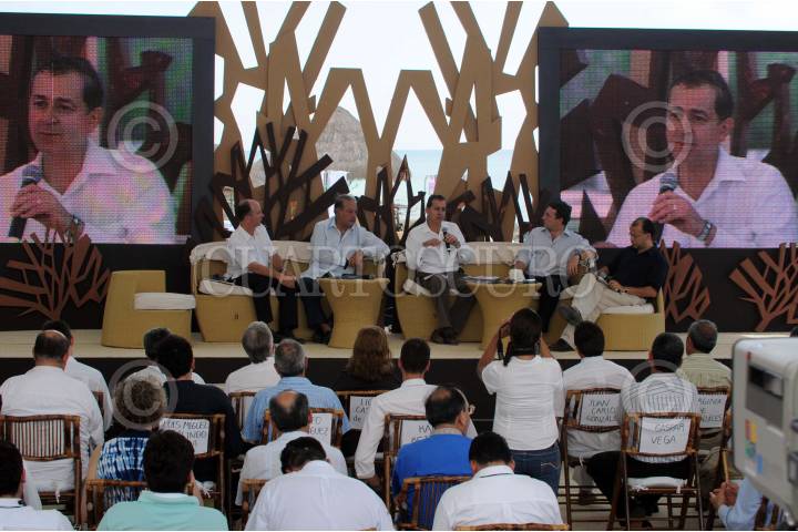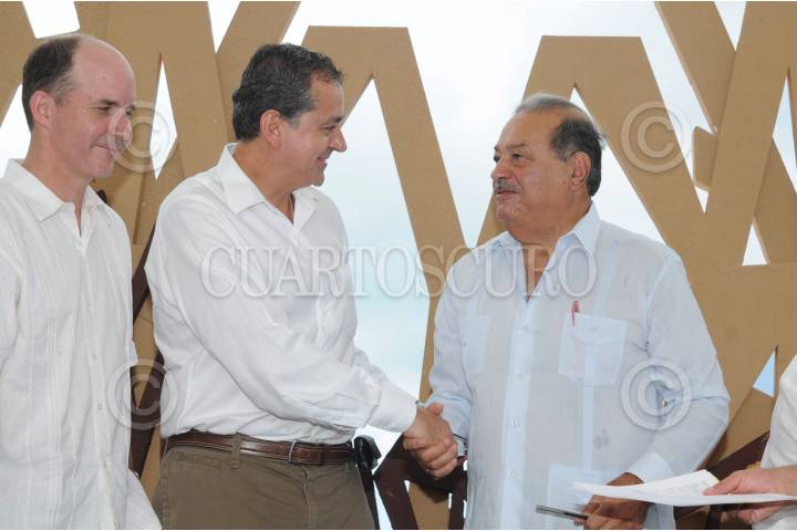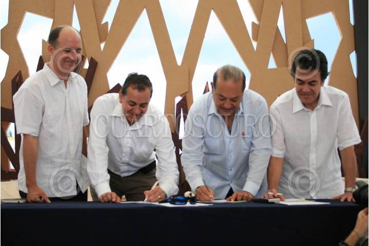COZUMEL, QUINTANA ROO, 04JUNIO2009.- El secretario del Medio Ambiente, Juan Rafael Elvira Quesada, Carlos Slim, presidente de la fundación Carlos Slim y Omar Vidal, de la World Wildlife Fundation, durante la firma del convenio de colaboración entre (WWF) la Fundación Carlos Slim y el Gobierno Federal, para la conservación de la Biodiversidad y promoción del Desarrollo Sustentable de México. FOTO: XIMENA DE LA SERNA/CUARTOSCURO.COM