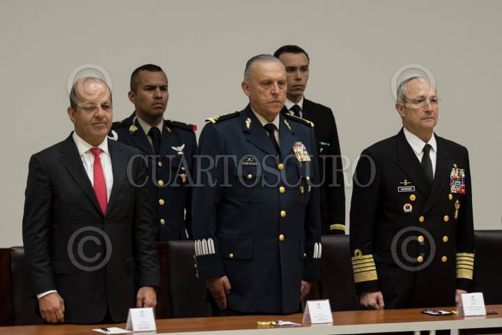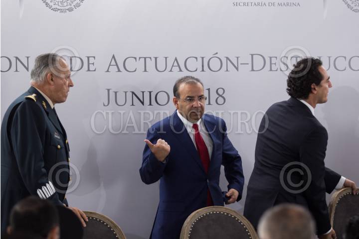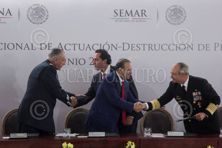 CIUDAD DE MÉXICO, 11JUNIO2018.- Salvador Cienfuegos Zepeda, secretario de la Defensa Nacional; Alberto Elías Beltrán, subprocurador Jurídico y de Asuntos Internacionales y encargado de despacho de la PGR, Alfonso Navarrete Prida, secretario de Gobernación, y Vidal Francisco Soberón Sanz, secretario de Marina, durante la firma del “protocolo nacional de actuación destrucción de plantío ilícitos”, en las inmediaciones de la agencia de Investigación Criminal de la Procuraduría General de la República (PGR). FOTO: GALO CAÑAS /CUARTOSCURO.COM