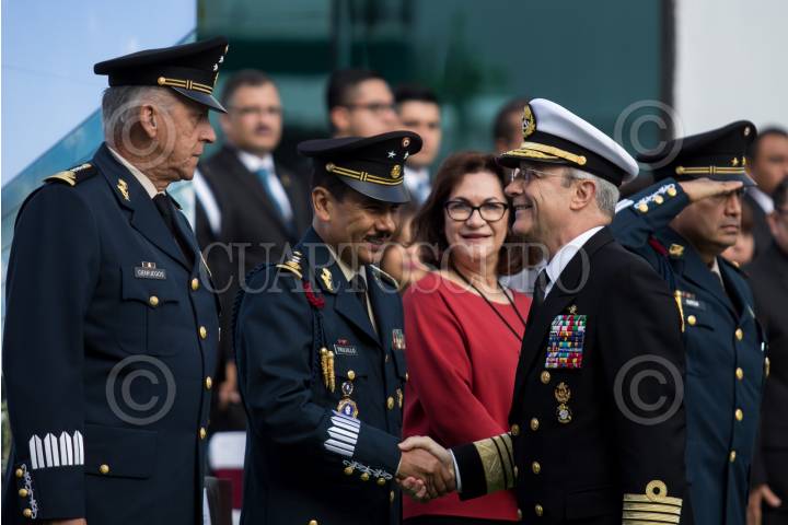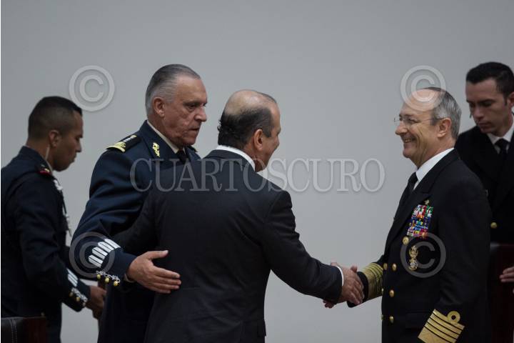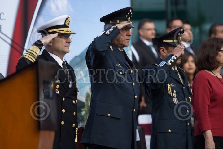 CIUDAD DE MÉXICO, 16JULIO2018.- Vidal Francisco Soberón Sanz, secretario de Marina; Salvador Cienfuegos Zepeda, secretario de la Defensa Nacional, y René Trujillo Miranda, director general del Banco Nacional del Ejército, Fuerza Aérea y Armada, S.N.C., encabezaron la Ceremonia del “71 Aniversario de la Creación del Banco Nacional del Ejército, Fuerza Aérea y Armada, S.N.C.”, en las instalaciones de la Matriz de citada Institución Bancaria. FOTO: GALO CAÑAS /CUARTOSCURO.COM