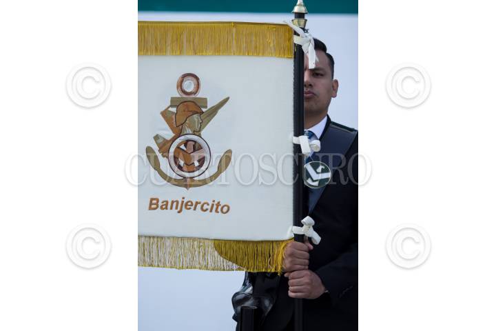 CIUDAD DE MÉXICO, 16JULIO2018.- Un trabajador de Banjercito sostiene un estandarte con el nombre de la institución bancaria durante la ceremonia del “71 Aniversario de la Creación del Banco Nacional del Ejército, Fuerza Aérea y Armada, S.N.C.”, en las instalaciones de la Matriz de citada Institución Bancaria. FOTO: GALO CAÑAS /CUARTOSCURO.COM