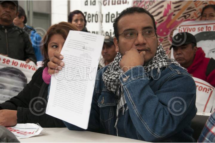 CIUDAD DE MÉXICO, 17MAYO2016.- Vidulfo Rosales, abogado de los padres de los 43 normalistas desaparecidos el 26 de septiembre en Iguala, Guerrero, y Felipe de la Cruz Sandoval, vocero, encabezaron la conferencia de prensa tras concluir la reunión que sostuvieron con la titular de la PGR Arely Gómez. Los familiares de los estudiantes de la normal rural "Isidro Burgos" exigieron la renuncia de Tomás Zerón, titular de la Agencia de Investigación Criminal. FOTO: MOISÉS PABLO /CUARTOSCURO.COM
