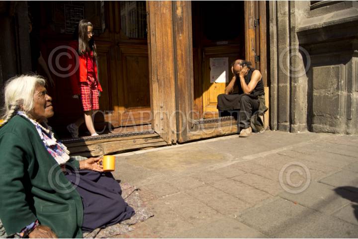 MÉXICO, D.F., 03MARZO2012.- Una anciana pide limosna afuera de una iglesia en el centro de la ciudad, al mismo tiempo sentado en la puerta del templo, un hombre parece pensar profundamente acerca de la vida. FOTO: PEDRO ANZA /CUARTOSCURO.COM