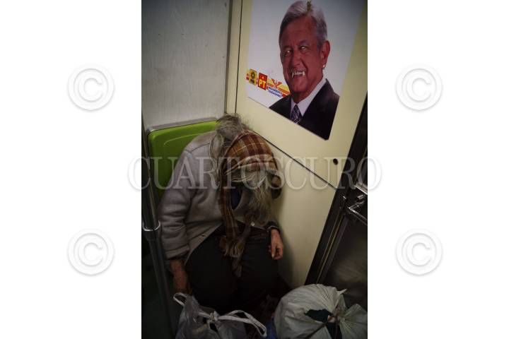 MÉXICO, D.F., 21MAYO2012..- Una persona de la tercera edad duerme en los vagones del metro, atrás se observa un cartel de propaganda electoral. FOTO: PEDRO ANZA /CUARTOSCURO.COM