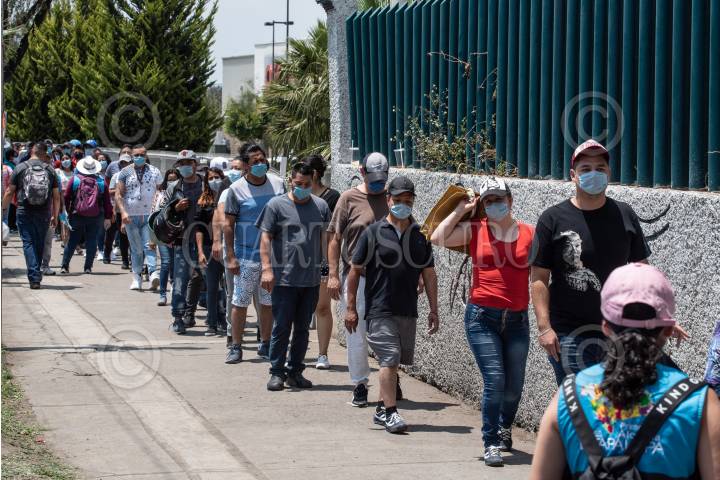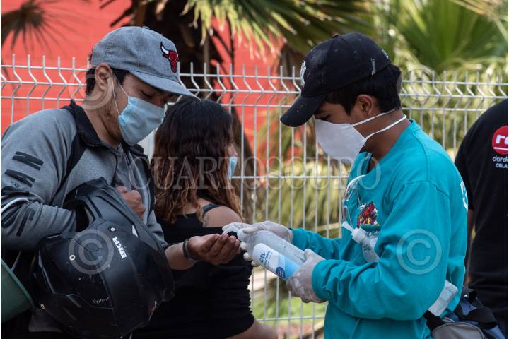 Autoridades de la alcaldía implementaron un operativo en el que distribuyeron cubrebocas y gel antibacterial a las personas que hacen fila para ingresar al mercado "La Nueva Viga: Pescados y Mariscos" durante la temporada de cuaresma y "Viernes Santo" a realizar compras pese a que se encuentra activada la emergencia sanitaria por la pandemia de coronavirus.