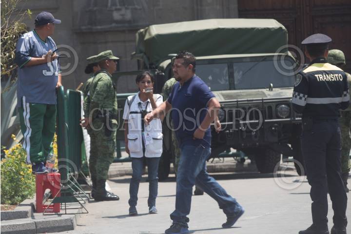 CIUDAD DE MÉXICO, 29MARZO2018.- Entre militares y ofiales de tránsito, un hombre montado en un banco rojo vigila con radios en mano para avisar a los vendedores ambulantes de la zona en caso de que se aproxime un operativo policial en su contra. FOTO: TERCERO DÍAZ /CUARTOSCURO.COM