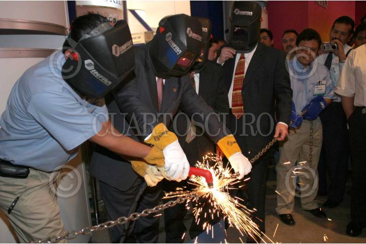 México, D.F.03FEB2004.- Juan Pablo Vilar Arvizu, vicepresidente de Canacintra y aspirante a la presidencia de este organismo, corta la cadena inagural de la expo Welmex 2004. FOTO: Juan Pablo Zamora/CUARTOSCURO.COM