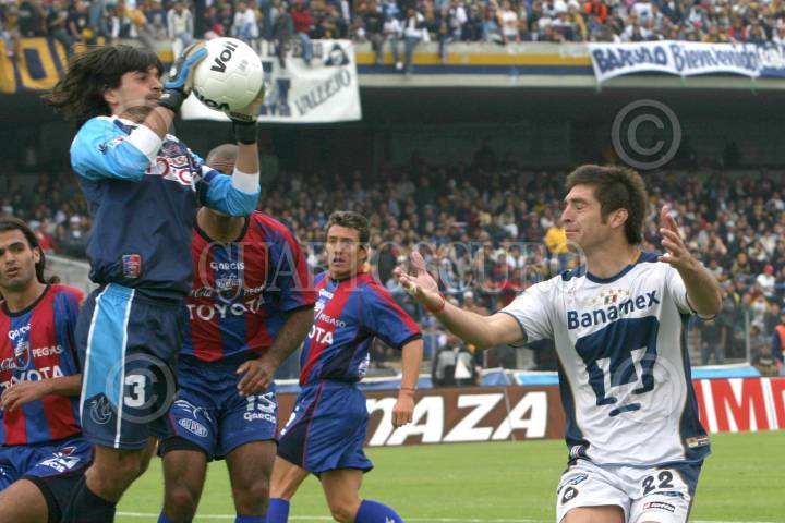 MEXICO, D.F. 23ENERO2005.- Federico Vilar, portero de Atlante detuvo un balón dirigido a Diego Alonso, delantero de Pumas, en el partido de la jornada 2 del torneo de clausura 2005 donde Atlante venció un gol por cero a Pumas de la UNAM, en el estadio de Ciudad Universitaria. FOTO: Iván Stephens/CUARTOSCURO.COM