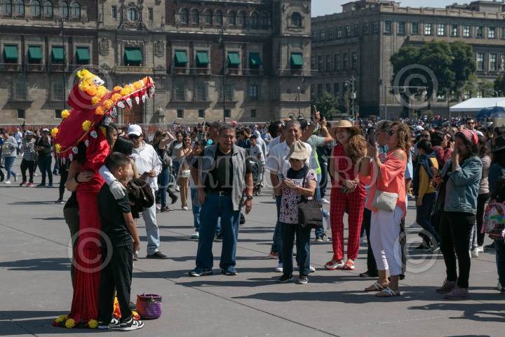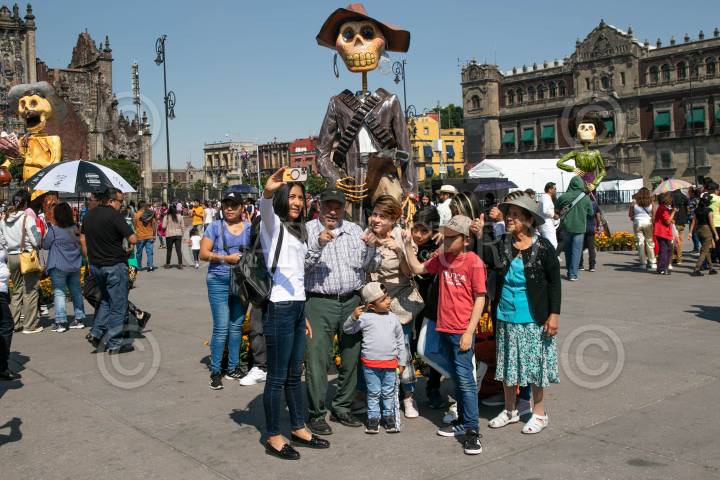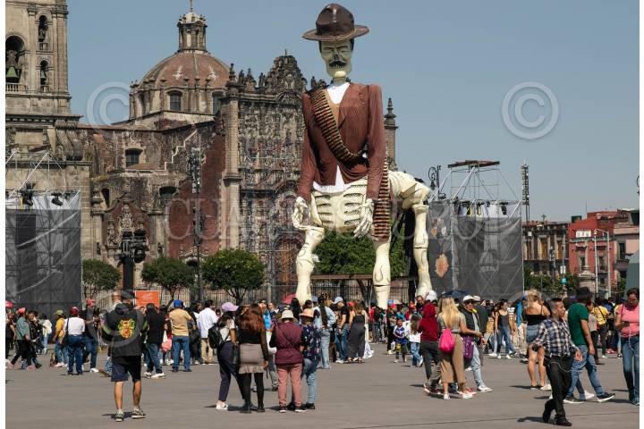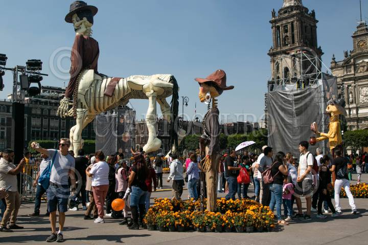 CIUDAD DE MÉXICO, 05NOVIEMBRE2023.- Capitalinos disfrutaron del último día de la Mega Ofrenda de Día de Muertos en el Zócalo en donde se sacaron la foto del recuerdo con las calacas gigantes, además en esta ocasión se sumaron las estatuas vivientes como una catrina que fue muy solicitada por los paseantes. FOTO: MOISÉS PABLO/CUARTOSCURO.COM