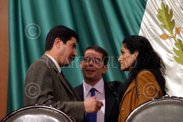 MEXICO, D.F. 08FEBRERO2006.- El senador Javier Corral, Genaro Villamil y la periodista Lydia Cacho al termino de la mesa de Despenalización de lo Delitos de Prensa Elementos una Reforma Legislativa, que tuvo lugar en el salón verde de la cámara de diputados. FOTO: Nelly Salas/CUARTOSCURO.COM