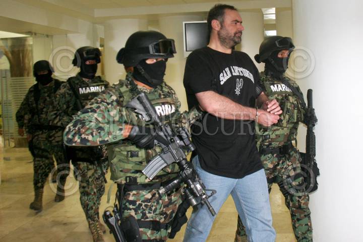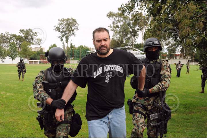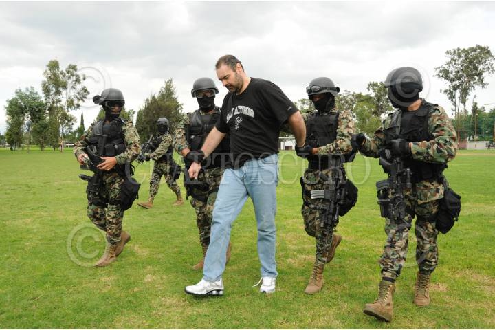 PUEBLA, PUEBLA, 12SEPTIEMBRE2010.- Alrededor de 30 elementos de la Infantería de Marina, realizaron un operativo en la zona residencial Puerta de Hierro, donde fue capturado el narcotraficante, Sergio Villarreal Barragán, "El Grande" quien es escoltado por elementos de la infantería de marina. FOTO: CUARTOSCURO.COM