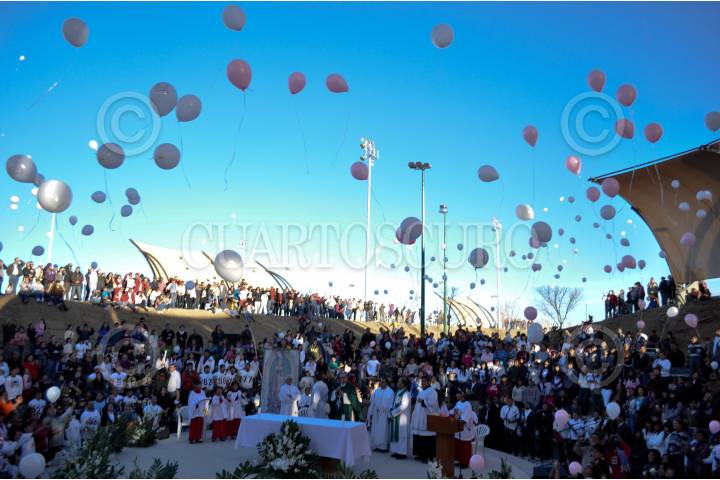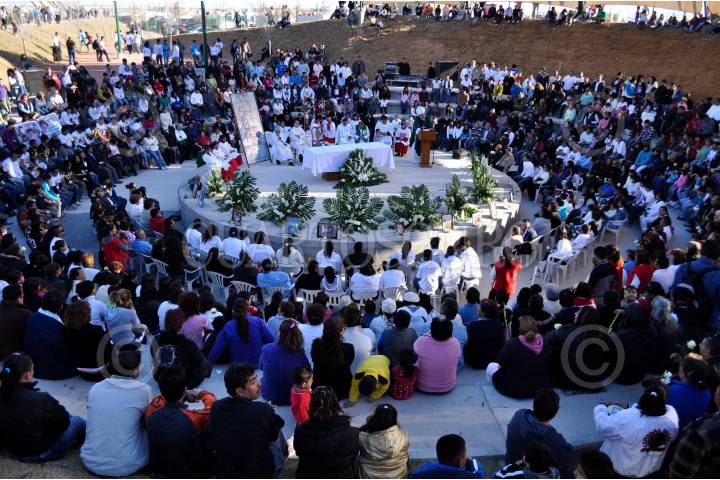CIUDAD JUAREZ, CHIHUAHUA, 30ENERO2011.- Esta tarde cientos de familias se congregaron en las instalaciones deportivas que construyó el gobierno federal, lugar en donde se ofició una misa encabezada por el Obispo Don Renato Asencio León y los familiares de las victimas que fueron ejecutadas en Villas de Salvarcar. En este renglón el representante de la Iglesia Católica en Ciudad Juárez, manifestó que con la visita de la primera dama del país se hizo entrega de material deportivo, sin embargo esta misa es para darles el adiós a estos jóvenes que en manos criminales perdieron la vida. FOTO: NACHO RUIZ/CUARTOSCURO.COM