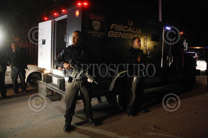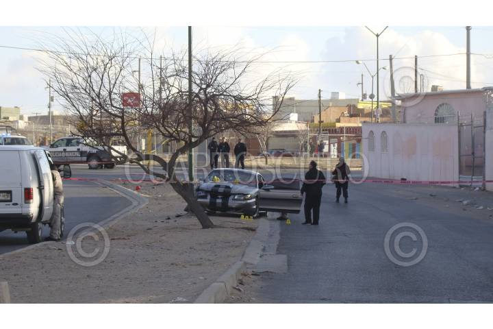 CIUDAD JUÁREZ, CHIHUAHUA, 24ENERO2012.- Dos agentes de la Policía Municipal fueron acribillados esta tarde a bordo de un vehículo particular en las inmediaciones del fraccionamiento Bosques de Salvárcar, lugar en que uno de ellos falleció. El ataque armado se registró en el cruce de las calles Durango y Palacio de Mitla, a unos cuantos metros de una escuela secundaria. Posterior a la agresión, los oficiales perdieron el control de vehículo Mustang, gris, en el que se trasladaban y se impactaron contra un poste tras subirse al camellón. FOTO: NACHO RUIZ/CUARTOSCURO.COM