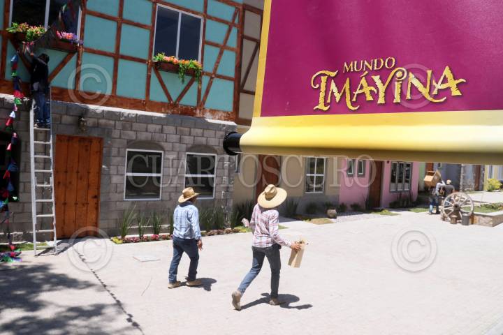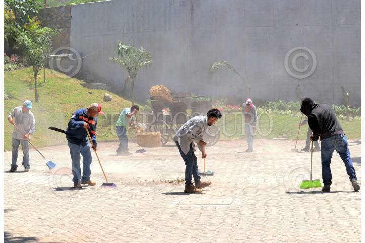 Un grupo de trabajadores barre una seccion del parque Mundo Imáyina levantado polvo.