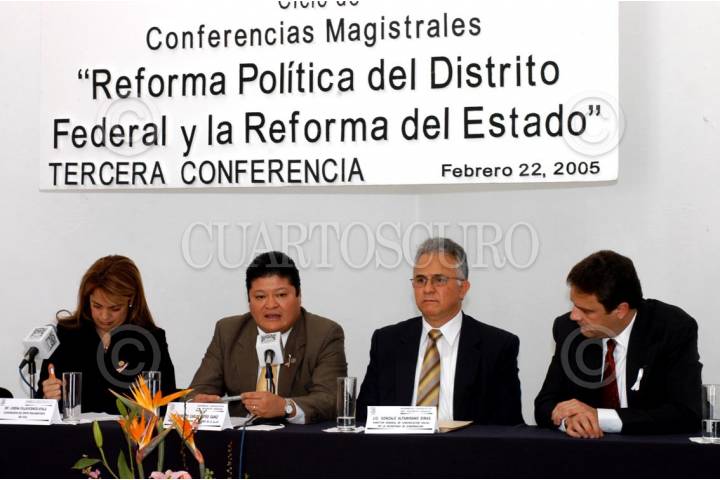 MEXICO, D.F. 22FEBRERO2005.- Los diputados Lorena Villavicencio, Carlos Reyes Gamiz, el vocero de la SEGOB, Gonzalo Altamirano Dimas, y José Espina, durante la conferencia magisterial ¨Reforma política del DF y la Reforma del Estado¨. FOTO: /CUARTOSCURO.COM