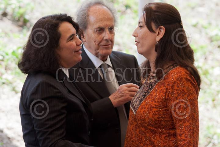 MÉXICO, D.F., 16JUNIO2011.- Consuelo Sáizar, presidenta del Conaculta, Teodoro González de León, arquitecto, y Teresa Villavicencio, directora del Palacio de Bellas Artes, durante la ceremonia de colocación de la primera piedra de las obras de ampliación y remodelación del Museo Tamayo. FOTO: MOISÉS PABLO/CUARTOSCURO.COM