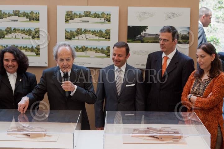 MÉXICO, D.F., 16JUNIO2011.- Consuelo Sáizar, presidenta del Conaculta, Teodoro González de León, arquitecto, David Cohen Sitton, presidente de la Fundación Olga y Rufino Tamayo (FORT), Marcelo Ebrard Casaubón, Jefe de Gobierno, y Teresa Villavicencio, directora del Palacio de Bellas Artes, durante la ceremonia de colocación de primera piedra de las obras para la ampliación y remodelación del Museo Tamayo. FOTO: MOISÉS PABLO/CUARTOSCURO.COM