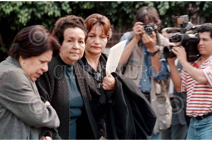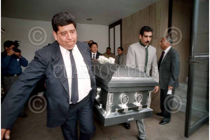 Amigos y familiares del ex oficial mayor de la PGR, Juan Manuel Izabal Villicaña salen de la agencia funeraría para acompañar el cuerpo al panteón Dolores. Alejandrina Victoria Martinez (folder en mano) es la viuda.