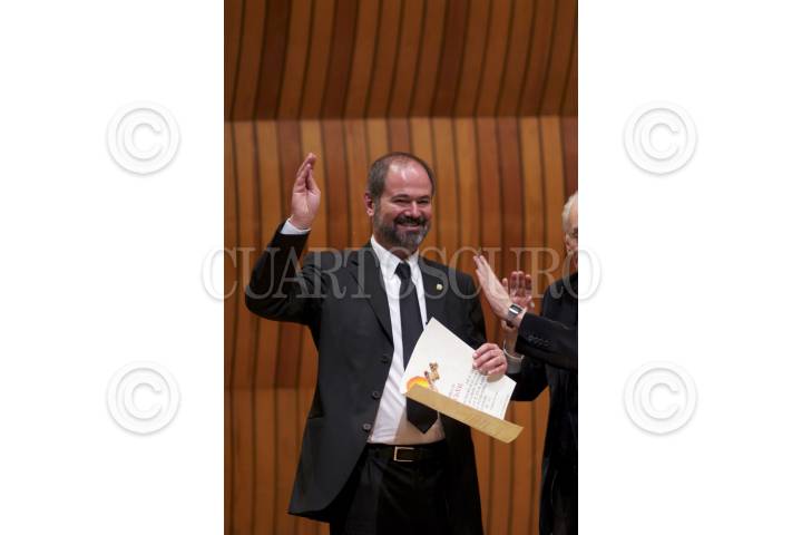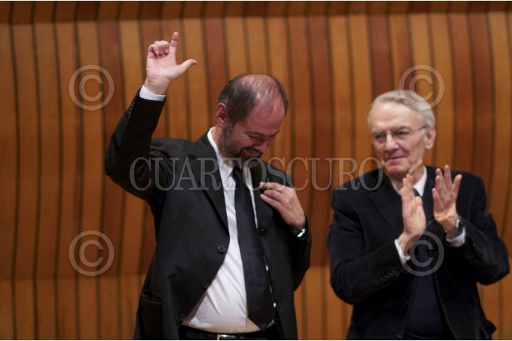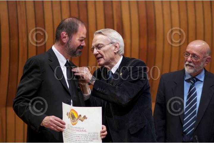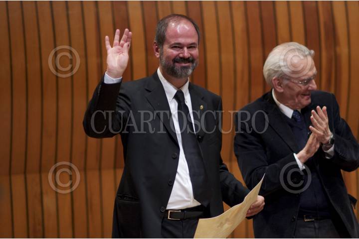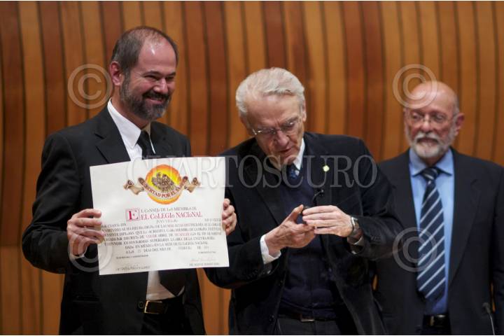 MÉXICO, D.F., 25FEBRERO2014.- Juan Villoro, ingresó al Colegio Nacional. Manuel Peimbert, le entregó la carta de ingreso, así como un pin en la ceremonia que se levó a cabo en El Colegio Nacional. FOTO: IVAN STEPHENS /CUARTOSCURO.COM