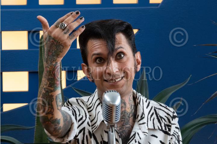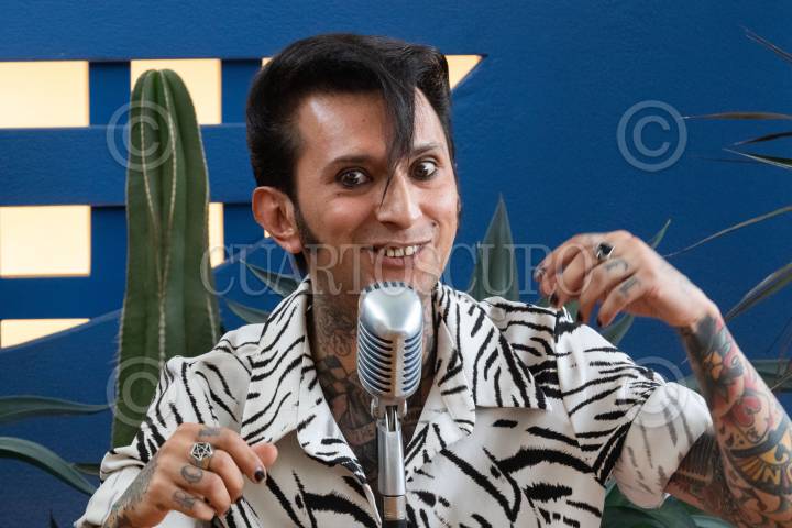 CIUDAD DE MÉXICO, 08JULIO2025.- Vicente Montes Rivera "Vince Monster", baterista y vocalista de la banda de rockabily "Rebel Cats", durante conferencia de prensa para dar detalles sobre su próxima presentación el 31 de julio en el Teatro de la Ciudad Esperanza Iris, con motivo de la celebración de sus 20 años de trayectoria. FOTO: MARIO JASSO/CUARTOSCURO.COM