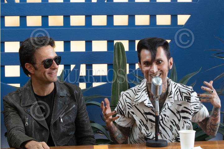 CIUDAD DE MÉXICO, 08JULIO2025.- Vicente Montes Rivera "Vince Monster", y Vicente Montes Ángeles "Vincent Van Rock", principales integrantes de la banda de rockabily "Rebel Cats", durante conferencia de prensa para dar detalles sobre su próxima presentación el 31 de julio en el Teatro de la Ciudad Esperanza Iris, con motivo de la celebración de sus 20 años de trayectoria.