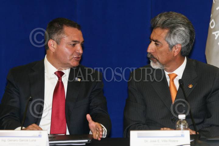 MÉXICO, D.F., 14ABRIL2009.- Genaro García Luna, secretario de Seguridad Pública, y Enrique Villa Rivera, director del IPN, durante la conferencia que ofrecieron para anunciar la cooperación entre la SSP federal y varias institutiones de educación universitaria. FOTO: ISAAC ESQUIVEL/CUARTOSCURO.COM