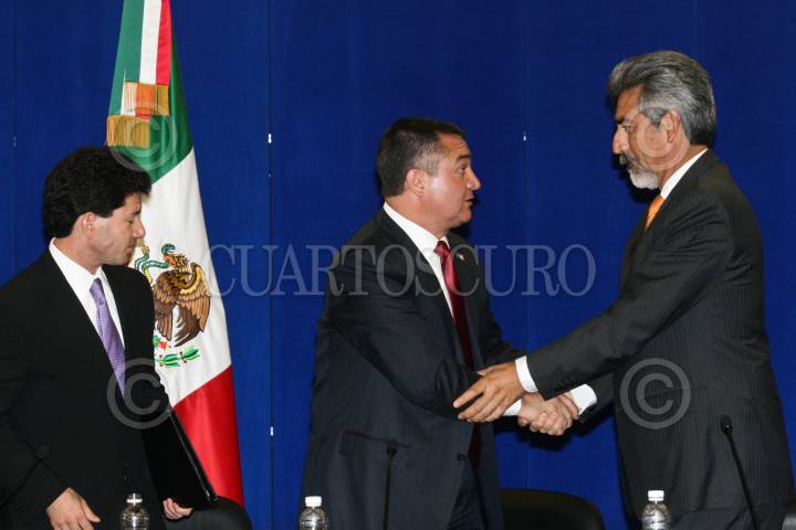 MÉXICO, D.F., 14ABRIL2009.- Genaro García Luna, secretario de Seguridad Pública federal, y Juan Manuel Durán Gutiérrez, rector de la Zona Metropolitana de la Ciudad de México del Tec de Monterrey, durante la conferencia donde anunció la cooperación entre la SSP federal y varias institutiones de educación universitaria. FOTO: ISAAC ESQUIVEL/CUARTOSCURO.COM